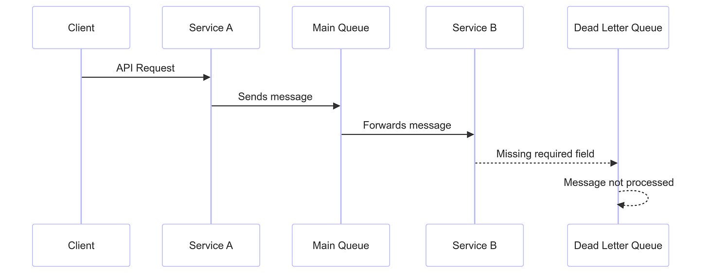 A silent failure might occur, for instance, when a message is diverted to a Dead Letter Queue, as we discussed earlier, due to a subtle error like a missing field in the message payload. Let’s imagine that a required field, such as a customer identifier, is missing. This absence won’t necessarily stop the entire system but will prevent that specific message from being processed correctly. Without this field, the service that is supposed to consume the message cannot complete its task, and the message ends up in the DLQ.