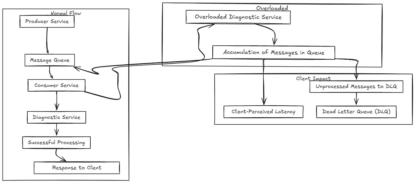 When a message is placed in a queue, the time it takes to be processed depends on how many other messages are already in the queue and how quickly the consumer services can handle them. If, for some reason, processing slows down—perhaps due to an overload in the diagnostic service or an unexpected increase in support requests—messages start to pile up. This creates a cascading effect: the more messages in the queue, the longer it takes for each new message to be processed.