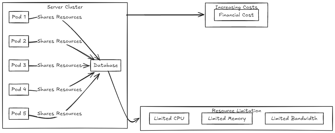 Resource contention is another critical issue. When you scale horizontally, all the pods or instances need to access shared resources, such as a central database, a cache service, or even the network. As the number of pods increases, they all compete for these resources.