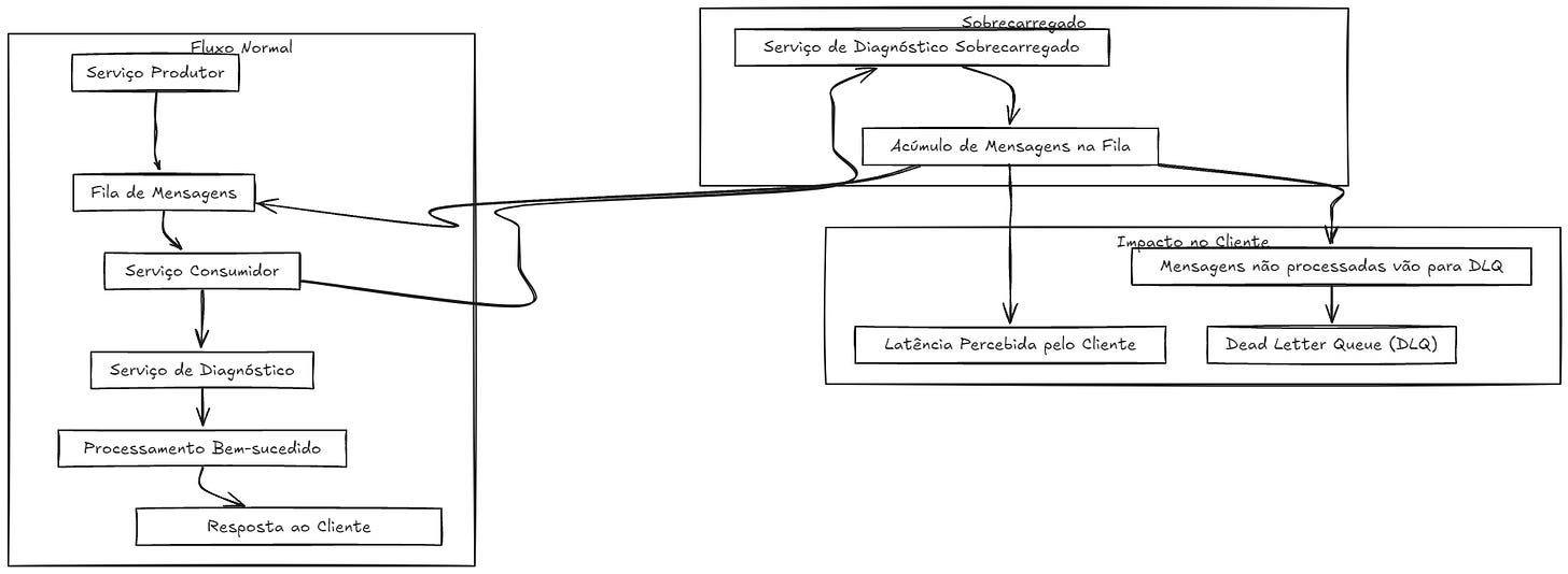 Quando uma mensagem é colocada em uma fila, o tempo necessário para que ela seja processada depende de quantas outras mensagens já estão na fila e de quão rapidamente os serviços consumidores conseguem lidar com elas. Se, por algum motivo, o processamento desacelerar — talvez devido a uma sobrecarga no serviço de diagnóstico ou a um aumento inesperado nas solicitações de suporte — as mensagens começam a se acumular. Isso cria um efeito cascata: quanto mais mensagens na fila, mais tempo cada nova mensagem levará para ser processada.