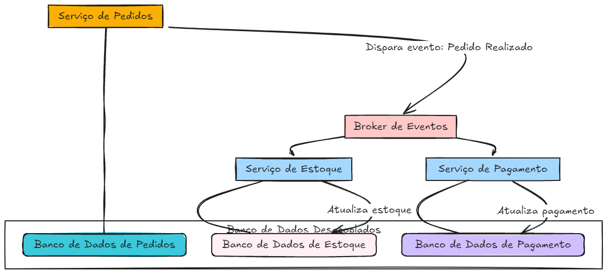 Em uma EDA, o Serviço de Pedidos dispara um evento de "Pedido Realizado", contendo todas as informações sobre o pedido (como os itens e quantidades compradas). O Serviço de Estoque escuta esse evento e usa essas informações para atualizar seu banco de dados, diminuindo a quantidade de produtos disponíveis. Da mesma forma, o Serviço de Logística pode ouvir o mesmo evento para iniciar o processo de envio.