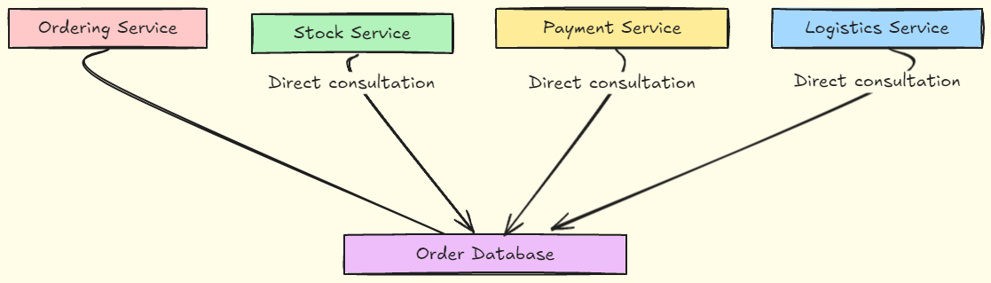 In an event-driven architecture, the scenario is different. Instead of making synchronous calls to query another service or sharing the same data schemas, a service simply listens to the events it needs. These events carry the relevant data so that each service updates its own database, without relying on a live query to another service's database.