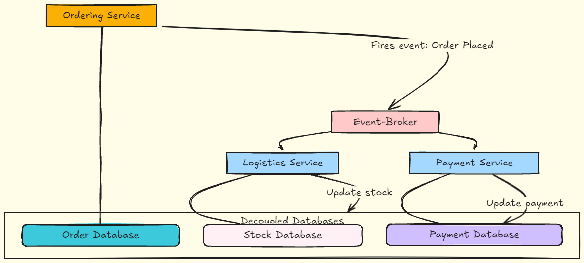 In an EDA, the Order Service emits an "Order Placed" event, containing all the information about the order (such as the items and quantities purchased). The Inventory Service listens to this event and uses that information to update its own database, reducing the available quantity of products. Similarly, the Logistics Service can listen to the same event to start the shipping process.