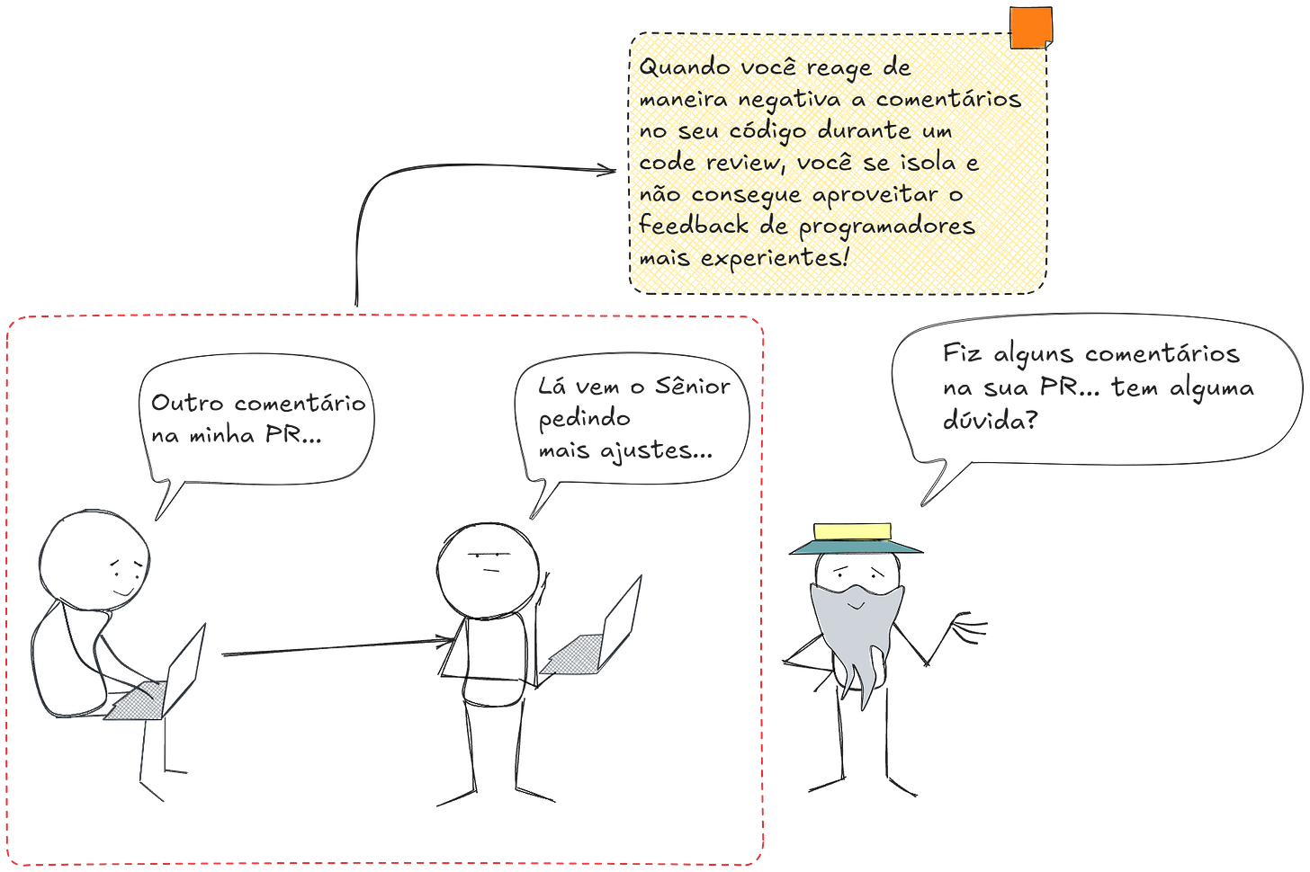 Quando o código é enviado para revisão, o autor não apenas abre uma Pull Request; ele também abre as portas para o feedback. E feedback nem sempre é fácil de lidar, especialmente quando envolve questionamentos à implementação de uma funcionalidade, à estrutura do código, ou até mesmo a uma escolha de variáveis de ambiente. Nesse momento, muitos desenvolvedores sentem um desconforto natural — afinal, ver algo que você escreveu ser questionado pode parecer, à primeira vista, um ataque ao seu trabalho.