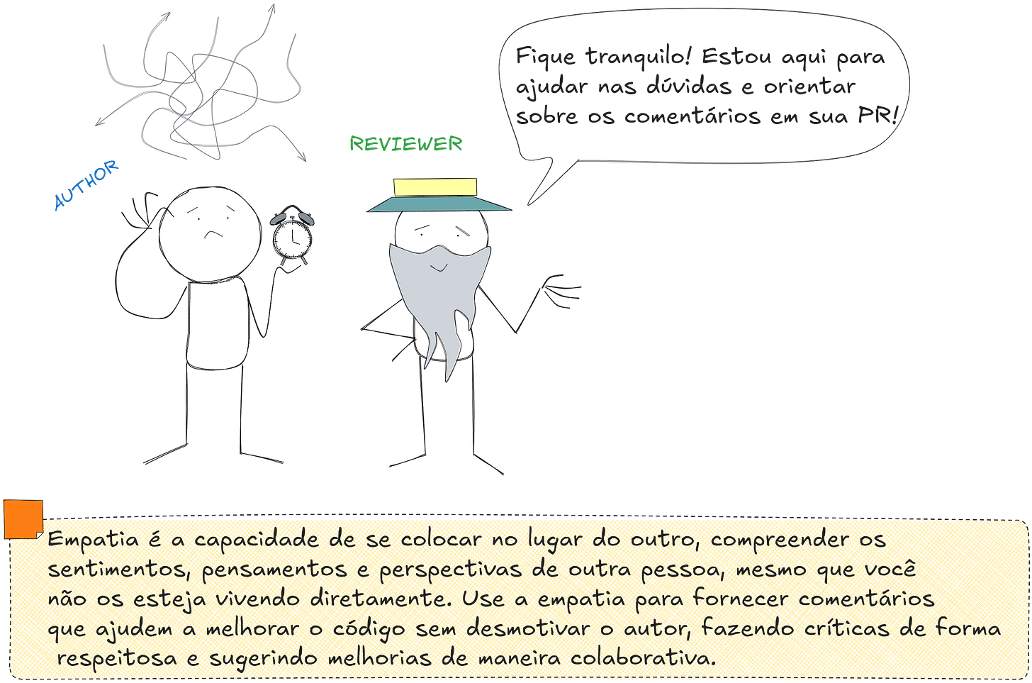 Se colocar no lugar do outro é fundamental nesse processo. Imagine estar sob pressão para entregar rapidamente uma funcionalidade e, ao receber a revisão, em vez de críticas duras ou isoladas, você recebe uma oferta de ajuda para resolver os problemas de forma mais eficaz. Isso humaniza o processo e cria um ambiente onde o autor se sente mais seguro para ajustar o código sem o peso de julgamentos.