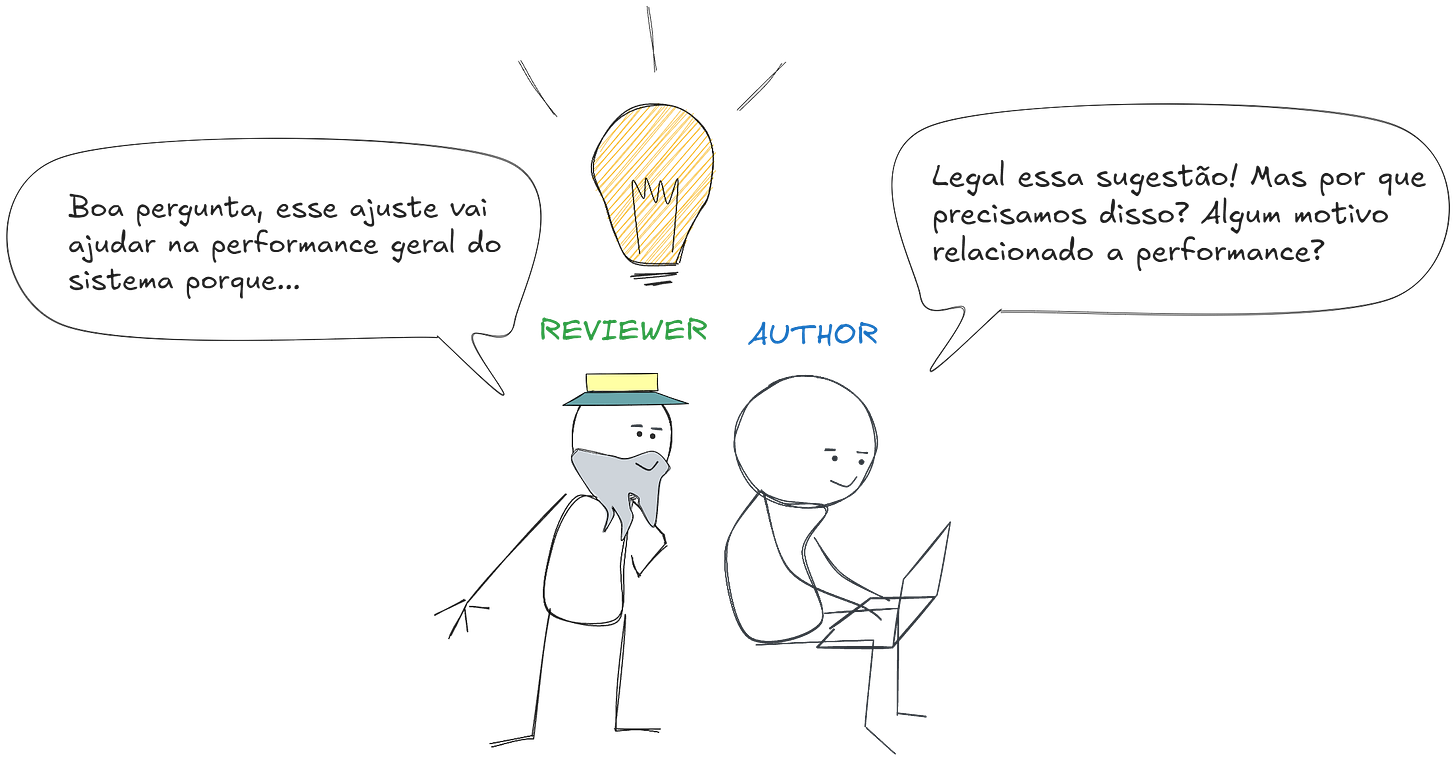 A revisão de código é, portanto, uma construção conjunta, onde tanto o revisor quanto o autor têm um papel ativo. O que o revisor aprova reflete não apenas a qualidade do código, mas a maturidade e a colaboração da equipe como um todo. Como disse Kent Beck: "Otimizo o time primeiro, depois o código" .