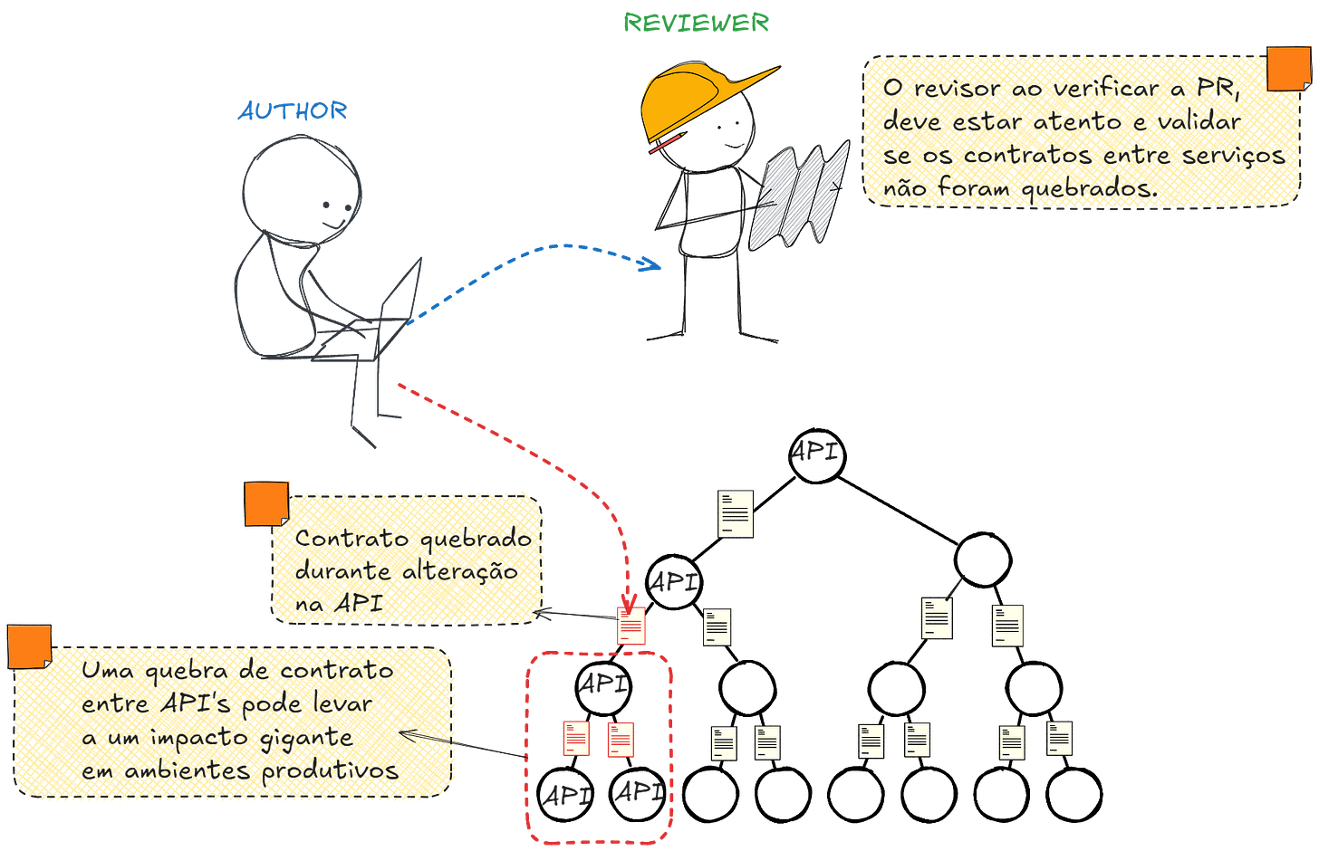 Outro aspecto crucial durante o code review, especialmente em corporações que seguem princípios como API First, é estar atento a possíveis quebras de contrato. APIs são o ponto de contato entre diferentes serviços e sistemas, e qualquer mudança que quebre o contrato estabelecido pode gerar falhas em cascata em diversas partes do sistema.