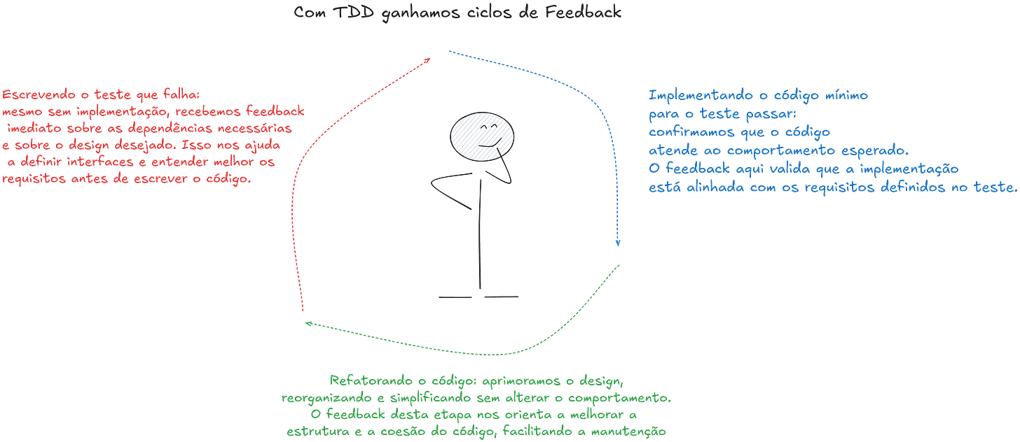 Com o TDD, o feedback se torna proativo e constante. Cada teste é uma forma automática de feedback que revela problemas ou validações antes mesmo de o código ser consolidado, orientando nossas decisões a cada etapa. Muitas vezes, esse feedback é tão natural e imediato que nem o percebemos, mas ele está lá, ajustando e confirmando o design continuamente e garantindo que o sistema permaneça no caminho certo.