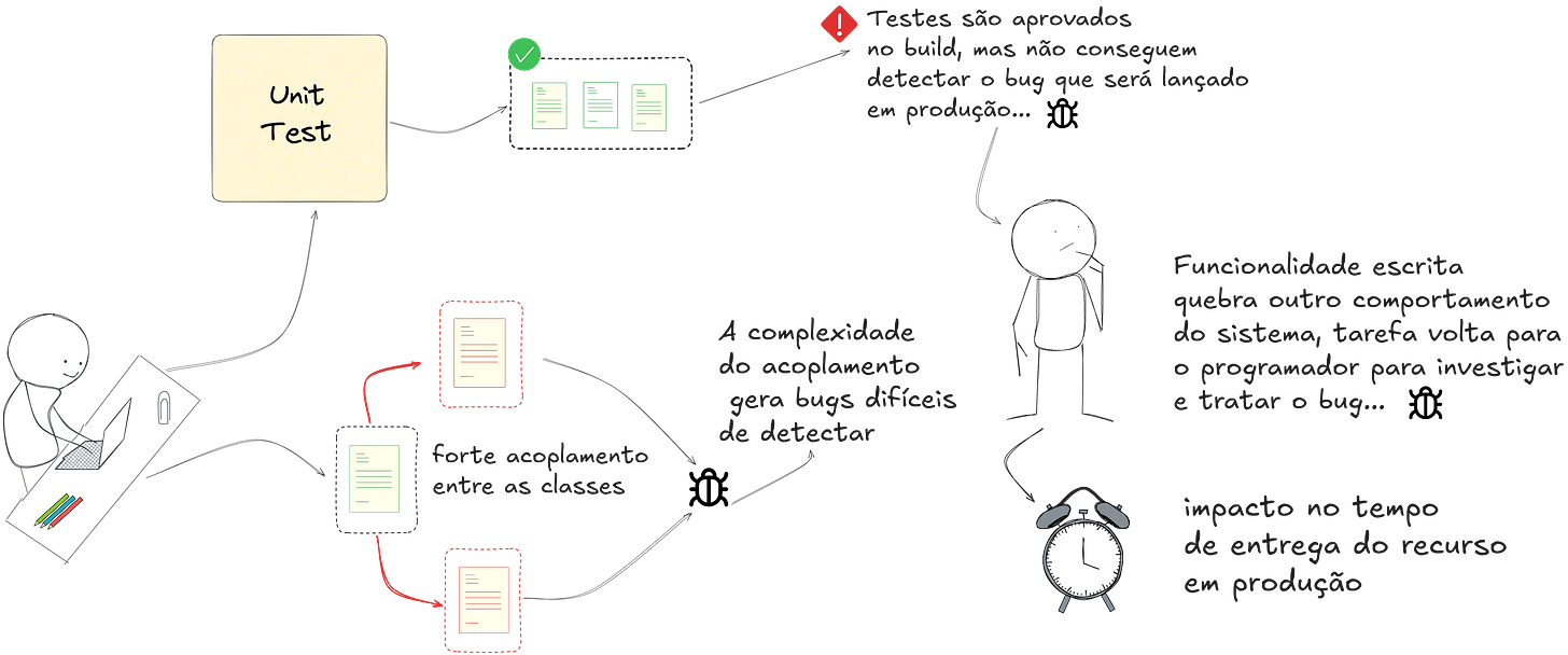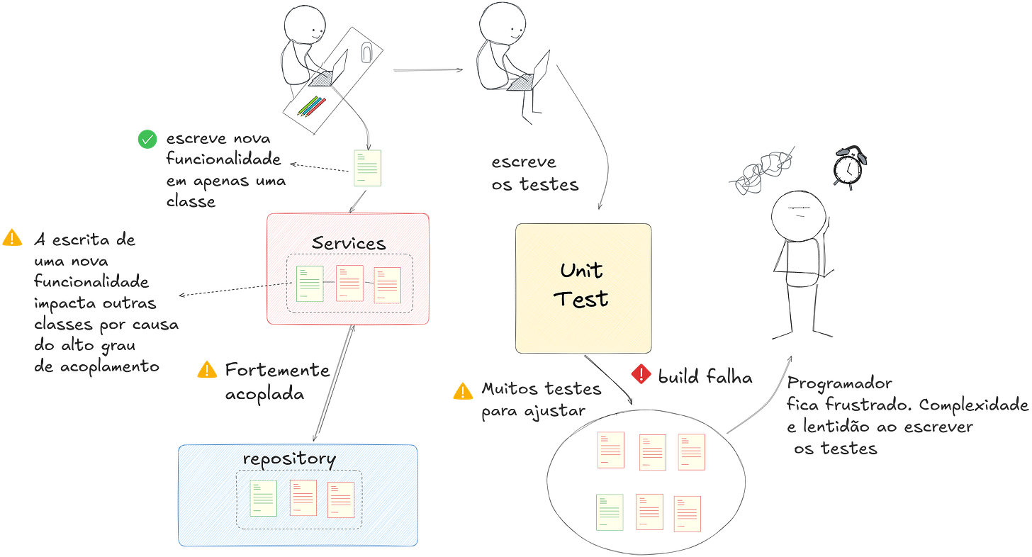 Em um monólito, cada mudança pode desencadear uma cadeia de problemas porque a estrutura não foi desenhada para suportar mudanças. E até mesmo em arquiteturas de microserviços, onde cada serviço deveria ser independente e autossuficiente, a falta de TDD pode resultar em um código acoplado, confuso e difícil de manter, mesmo dentro dos limites de um único serviço. Não adianta termos domínios segregados e contextos bem definidos se o código que forma a base de tudo dentro de cada microserviço é frágil, cheio de dependências invisíveis e desorganizado.