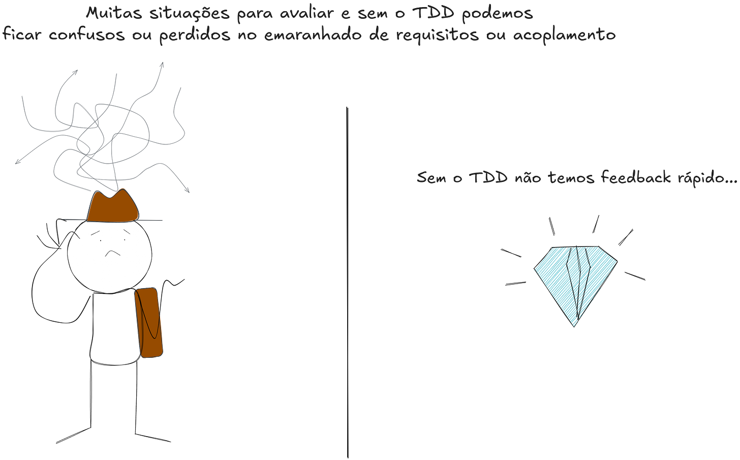 Quando não temos o TDD como guia, é fácil ignorar essas nuances ou deixar algumas para trás. A tendência é pensar que, se o caminho feliz está funcionando, o sistema está pronto para ser entregue. Muitas vezes, o feedback que recebemos chega tarde demais, expondo a necessidade de refatorar o código e exigindo ajustes significativos que poderiam ter sido evitados.