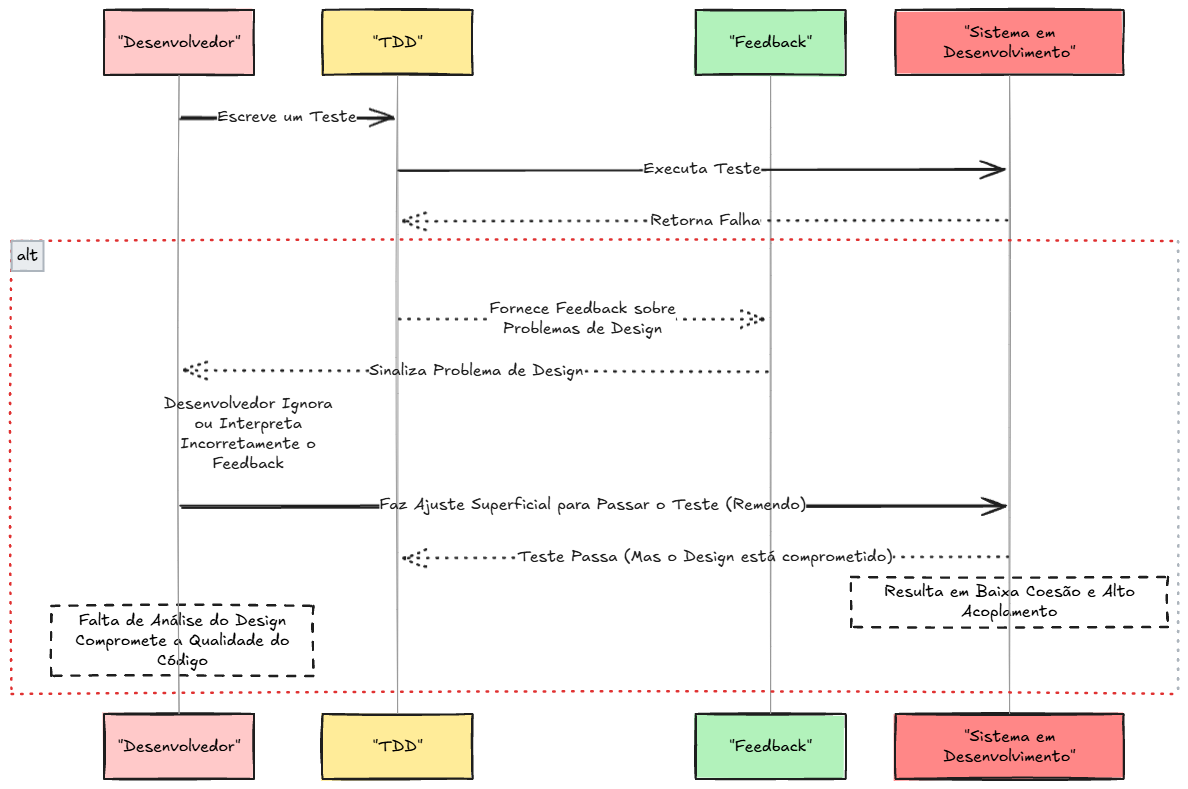 Ainda assim, nem todo feedback é interpretado corretamente. Alguns desenvolvedores aplicam o feedback de forma superficial, corrigindo o erro apontado apenas para que o teste passe, sem questionar a estrutura ou o design do código. Isso resulta em remendos que, a longo prazo, podem comprometer a coesão e a clareza da solução. O TDD, no entanto, incentiva uma análise mais profunda e o questionamento constante sobre a estrutura do código. Não é apenas sobre "fazer o teste passar" — é sobre entender se o design realmente suporta o comportamento esperado e se a coesão do código está sendo respeitada.