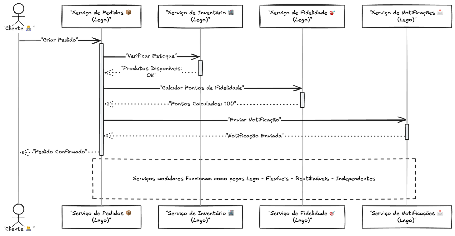 Essa simplicidade e modularidade são o que fazem do Lego um sucesso — cada peça tem um propósito claro e se integra sem comprometer o todo. 😄 Nos microserviços, buscamos essa mesma lógica: alterar uma “peça” ou comportamento sem precisar desmontar o sistema inteiro. 🛠️