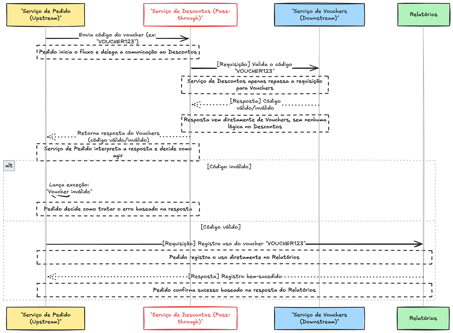 • Embora essa abordagem simplifique o fluxo, ela aumenta o acoplamento de domínio do Serviço de Pedido, que agora precisa conhecer os contratos tanto do Serviço de Vouchers quanto do Serviço de Relatórios. Isso pode ser aceitável em alguns cenários, mas deve ser cuidadosamente avaliado para evitar sobrecarregar o Serviço de Pedido com responsabilidades extras.