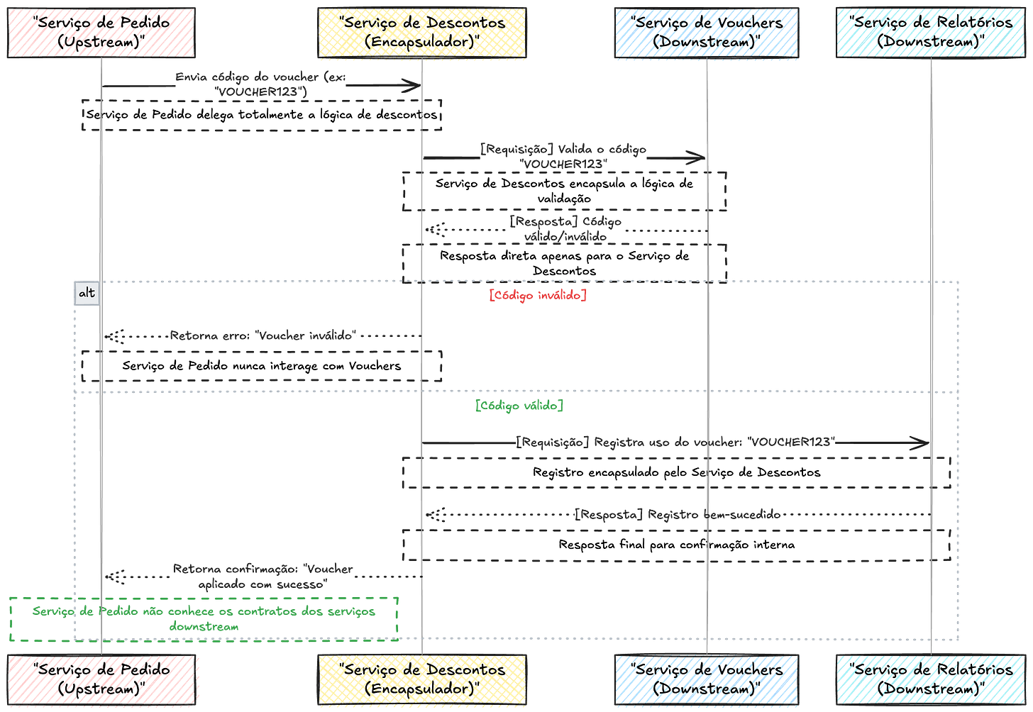 Quando dizemos que o Serviço de Descontos não encapsula verdadeiramente os contratos dos downstreams, significa que ele não esconde os detalhes dos serviços downstream (Vouchers e Relatórios) do Serviço de Pedido (upstream). Ele apenas repassa mensagens entre eles, mas não isola ou abstrai os contratos de modo eficaz.