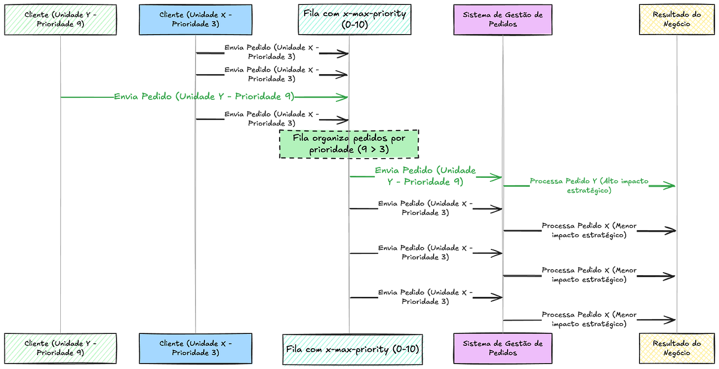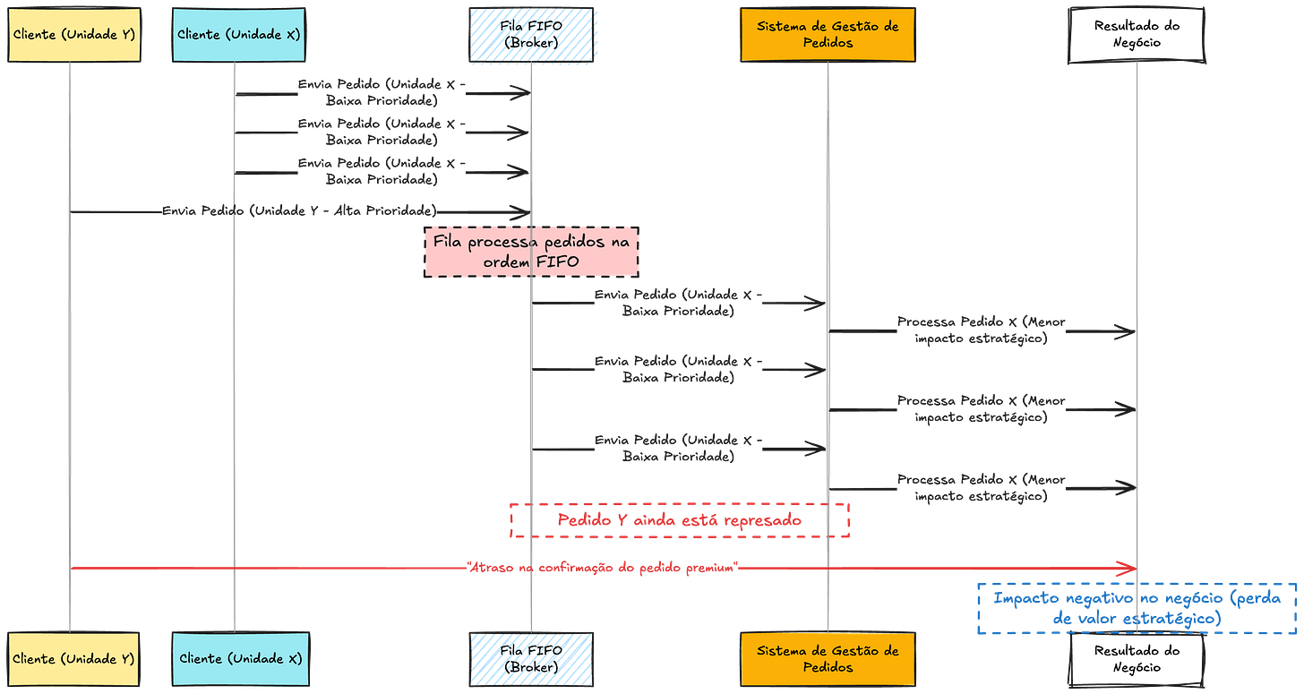 Veja no diagrama abaixo como isso acontece na prática: enquanto os pedidos menos prioritários monopolizam a fila, os pedidos críticos precisam aguardar, impactando o negócio de forma significativa.