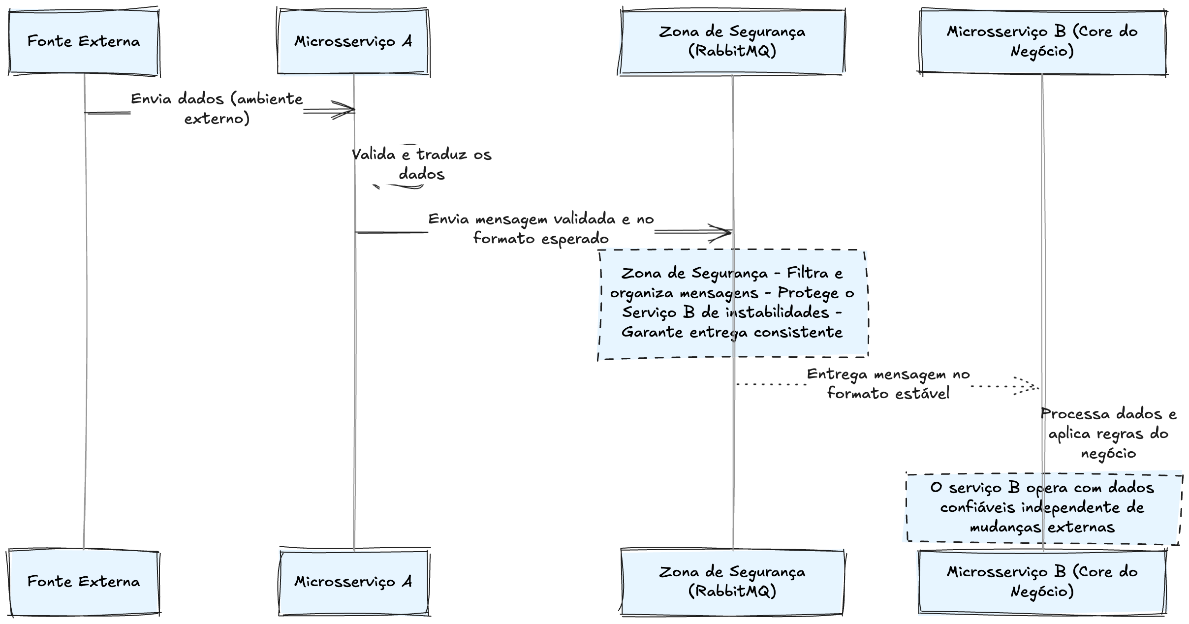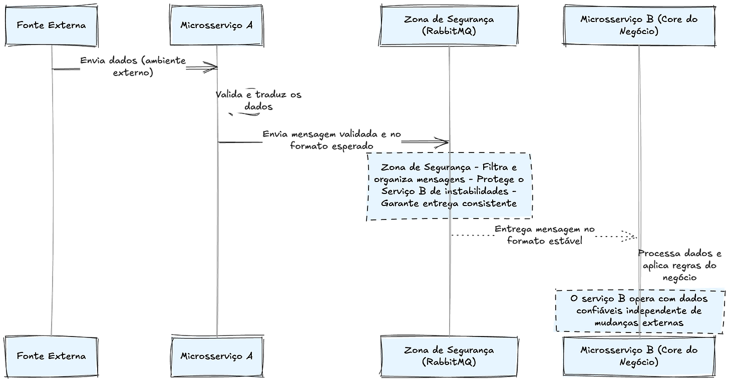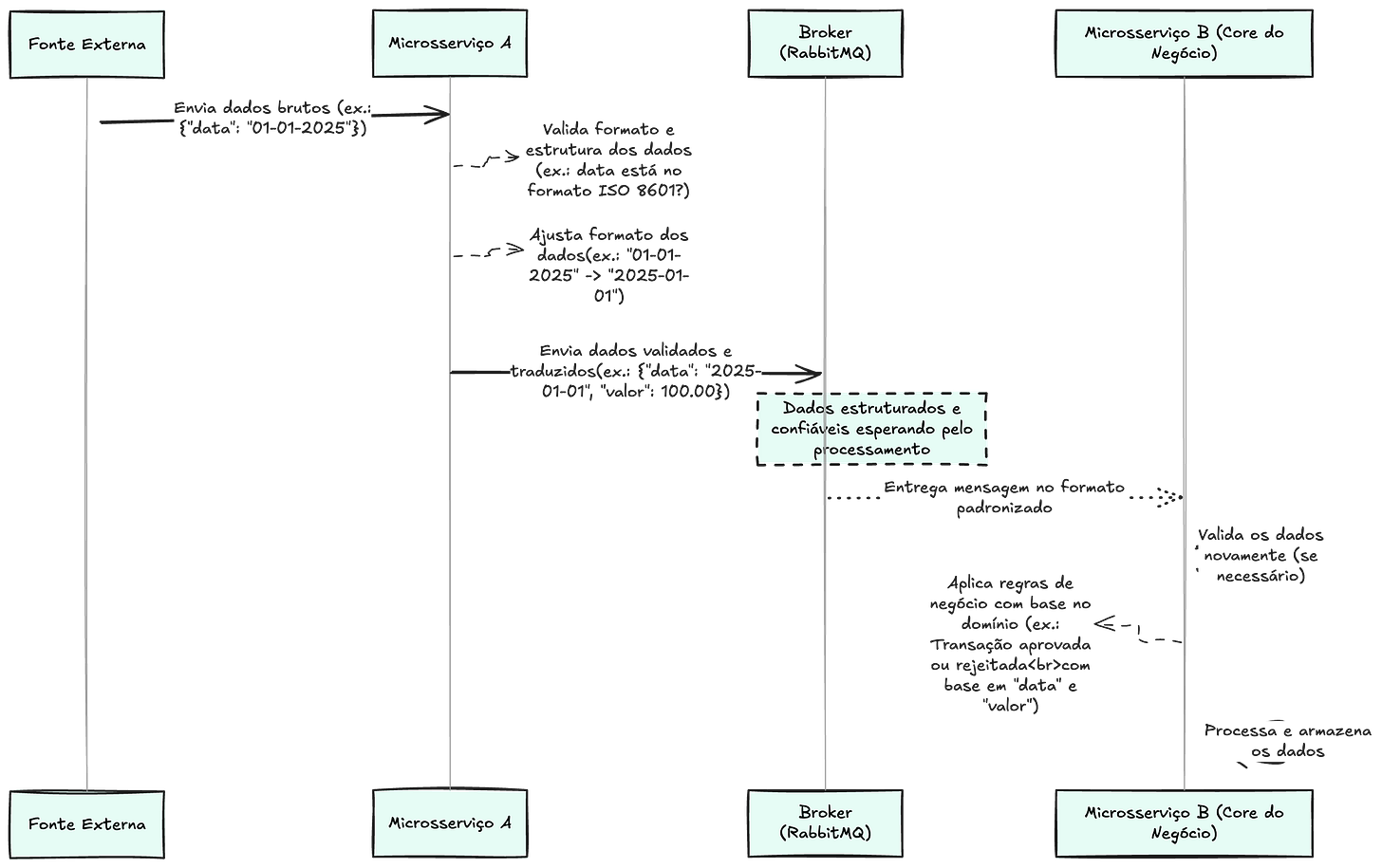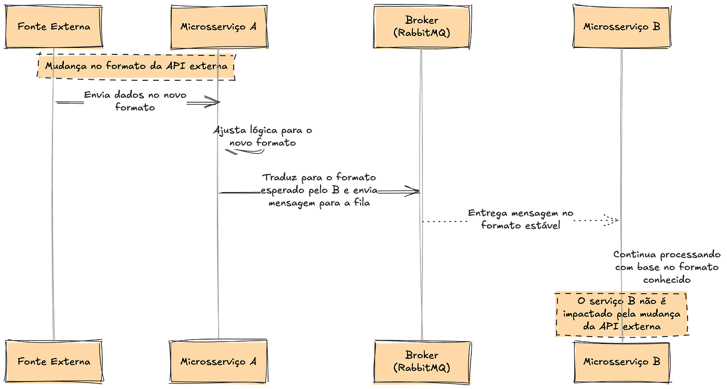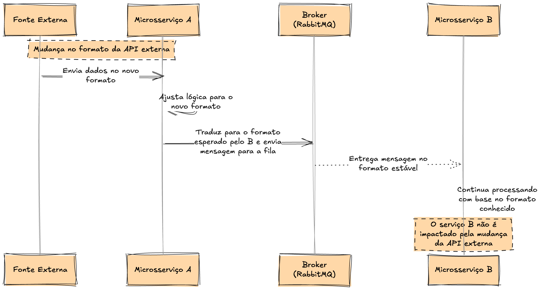 Quando dois serviços se comunicam, o objetivo é que essa comunicação seja previsível, confiável e fácil de manter. Se o Serviço A apenas “repassa” os dados externos no formato recebido, o Serviço B fica sujeito a mudanças fora do controle do sistema — como atualizações na API de terceiros.