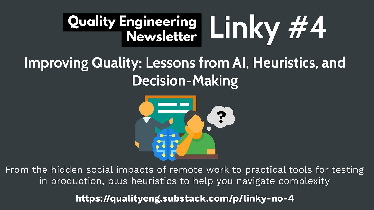 This week's Linky No. 4 is packed with thought-provoking reads on quality, decision-making, and AI. From the hidden social impacts of remote work to practical tools for testing in production, plus heuristics to help you navigate complexity, this roundup has something for every quality-minded engineer.
