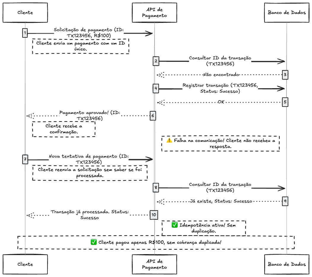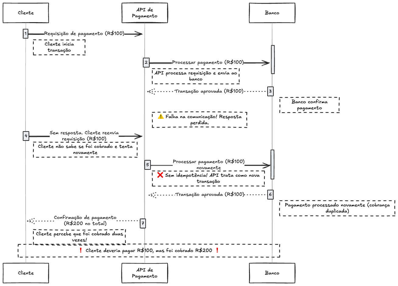Mas o que aconteceu nos bastidores? Sem idempotência, o sistema pode interpretar as duas tentativas como solicitações separadas.