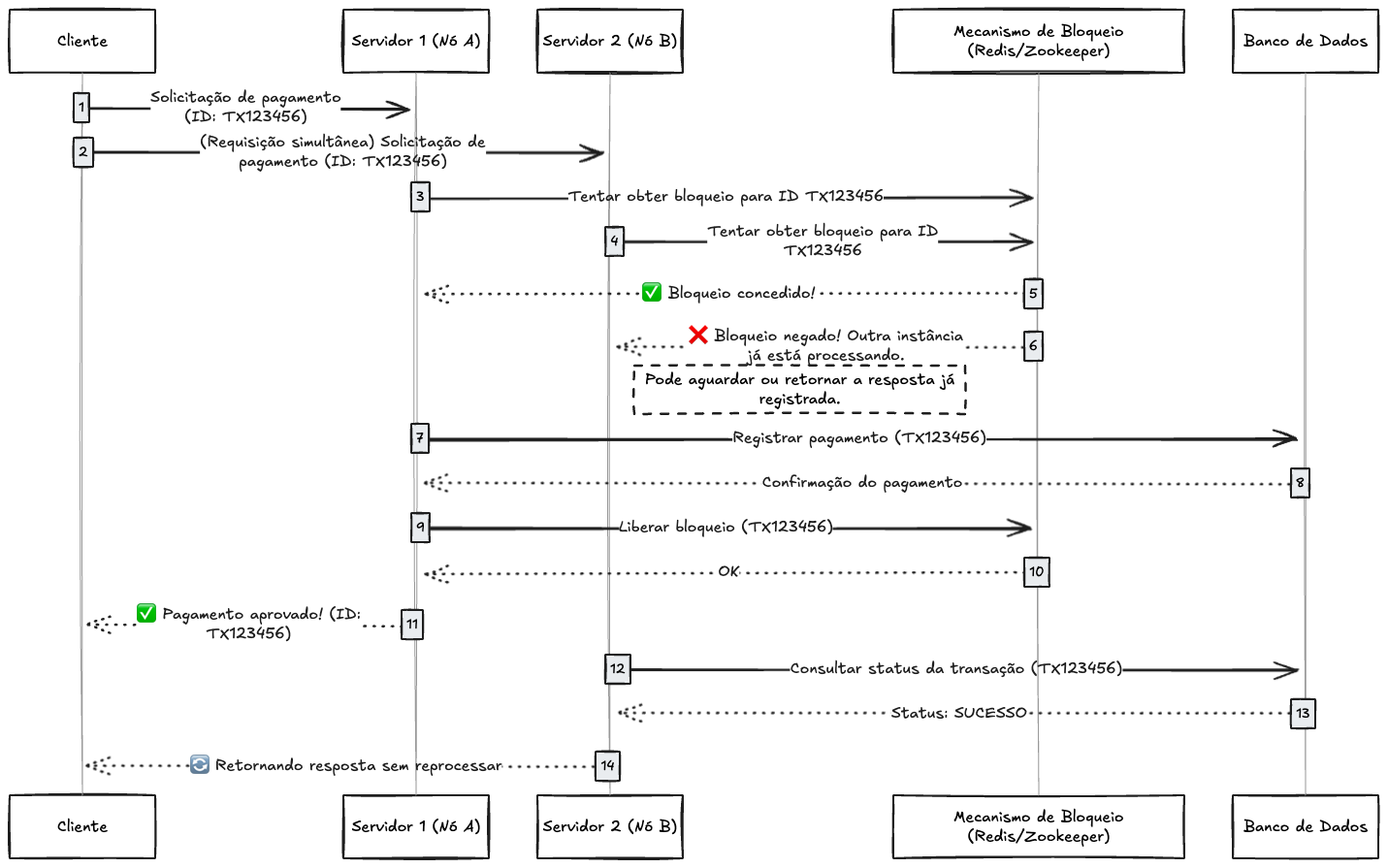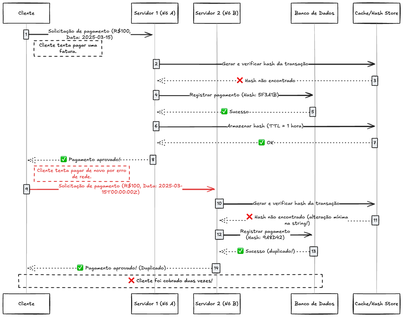 🔹 Exemplo: Um usuário inicia um pagamento, mas um atraso na rede impede que o servidor receba a solicitação a tempo. O usuário, sem saber o que aconteceu, clica novamente no botão de pagamento. Sem um controle adequado, o sistema pode processar a transação duas vezes, resultando em cobrança duplicada.