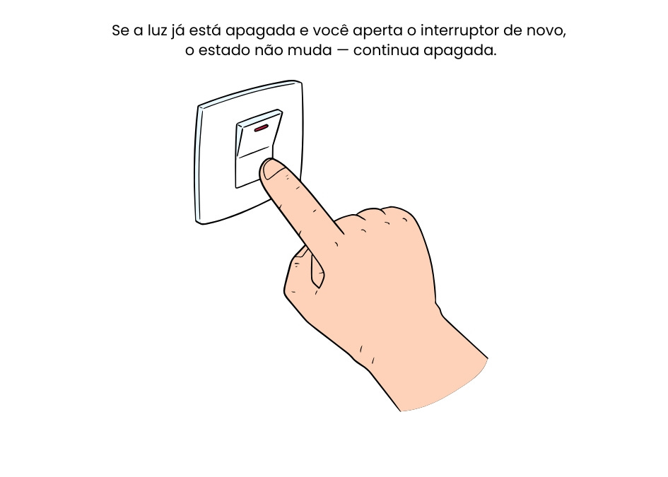 Agora, trazendo isso para o nosso cotidiano: imagine um interruptor de luz. Se a luz já está apagada e você aperta o interruptor novamente para tentar apagá-la, nada acontece. O estado permanece o mesmo — a luz continua apagada. O efeito é o mesmo, seja você acionando o interruptor uma vez ou várias, desde que a luz já esteja apagada.