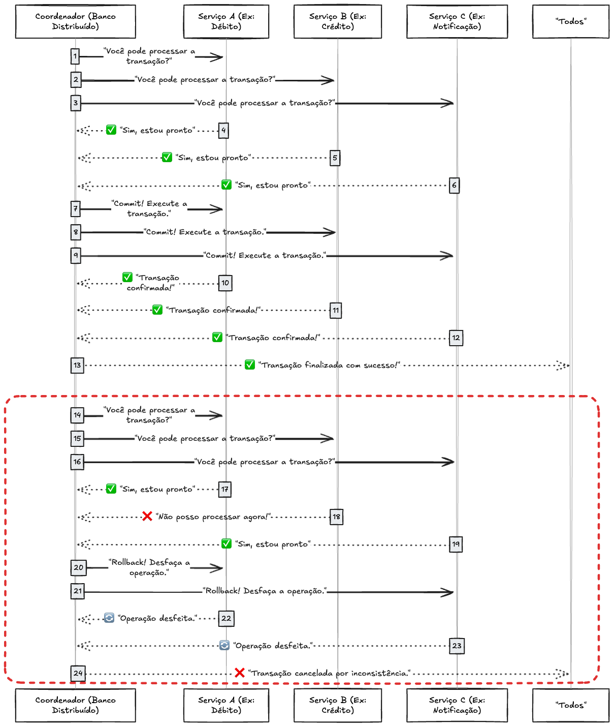 ✅ Se você precisa garantir que tudo aconteça ao mesmo tempo (ou nada aconteça) → Use Two-Phase Commit (2PC).