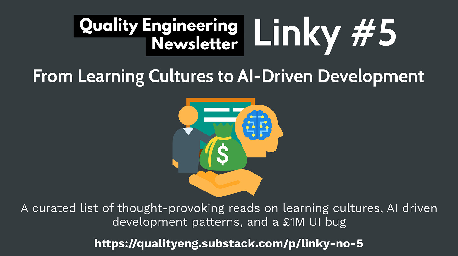 This week's Linky No. 5 rounds up key insights shaping quality engineering, from the role of leaders in building learning cultures to the real-world cost of software bugs—like a £1M UI error. It explores how AI development patterns, from "vibe coding" to AI-assisted test automation, and questions whether LLMs can truly uncover unknown unknowns. Plus, a look at why rigid frameworks can hinder team growth and how AI-enabled development is evolving.
