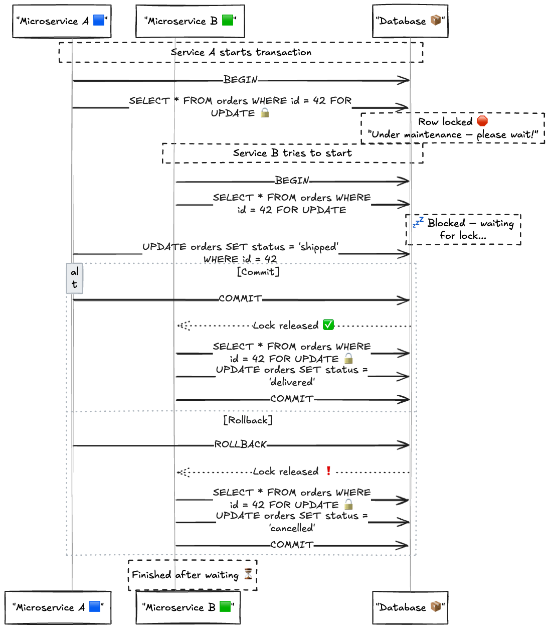 Além disso, em sistemas distribuídos (como APIs modernas ou microsserviços), manter esse tipo de lock entre serviços separados é quase impossível. Os bancos não conversam entre si de forma nativa, e você perde a consistência global.