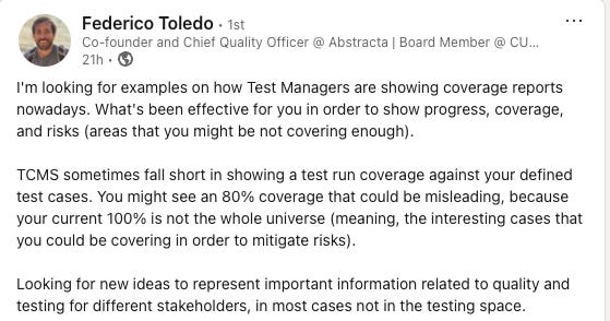 Federico Toledo reached out to me and asked for my opinion about what test managers are doing to show test coverage. This is part one of a two part blog. This focuses on in-house quality teams and development. The second part will focus on consulting/outsourced quality metrics.