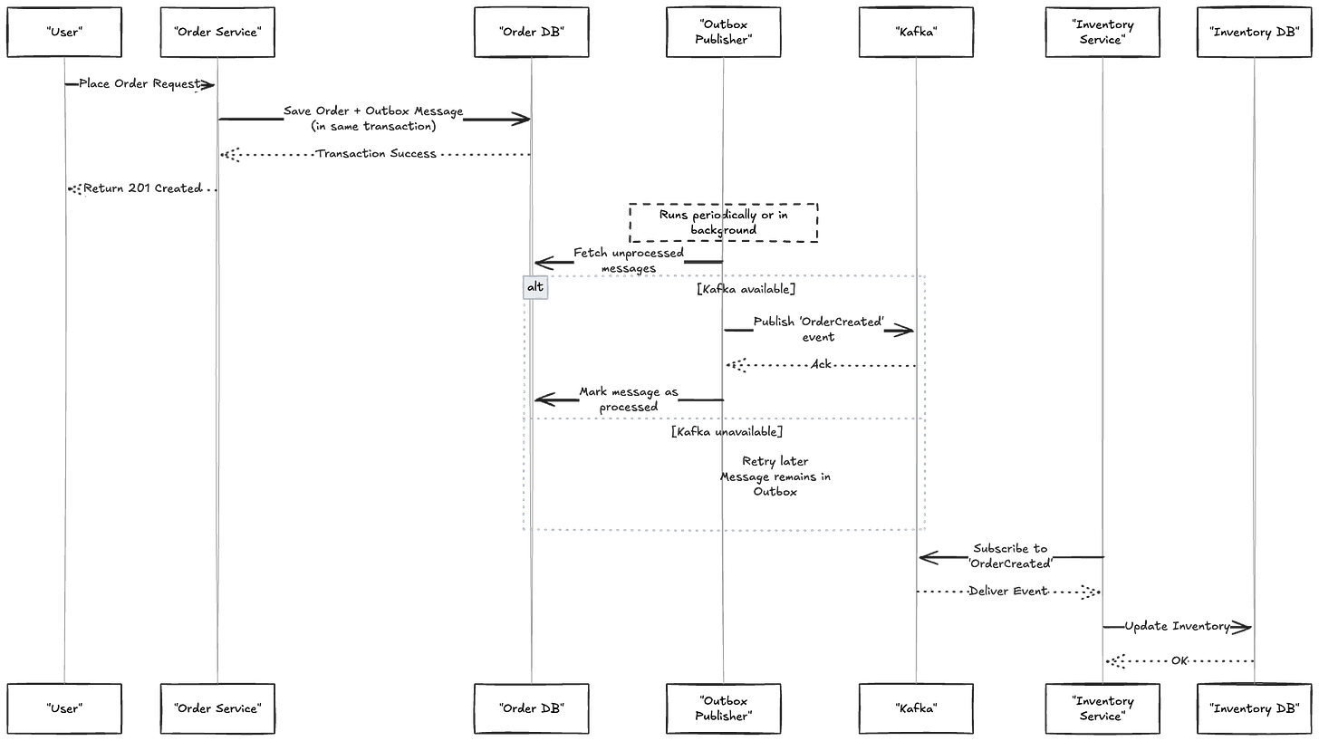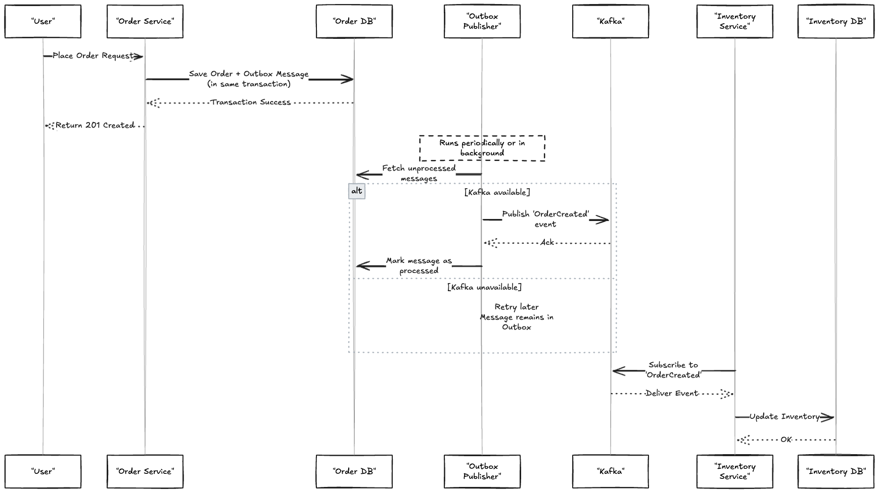Esse tipo de falha acontece porque salvar no banco de dados e enviar uma mensagem (pra uma fila, serviço de e-mail, ou outro sistema) são duas operações separadas — e se uma falhar depois da outra, temos um problema.