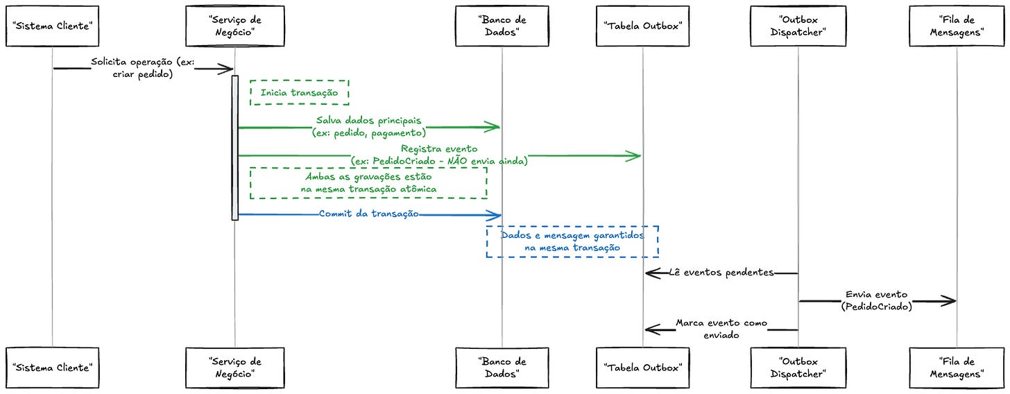Esse caderninho é a Outbox. Ele garante que, mesmo que alguma parte do processo falhe temporariamente, a informação essencial foi salva com segurança e pode ser enviada assim que for possível.
