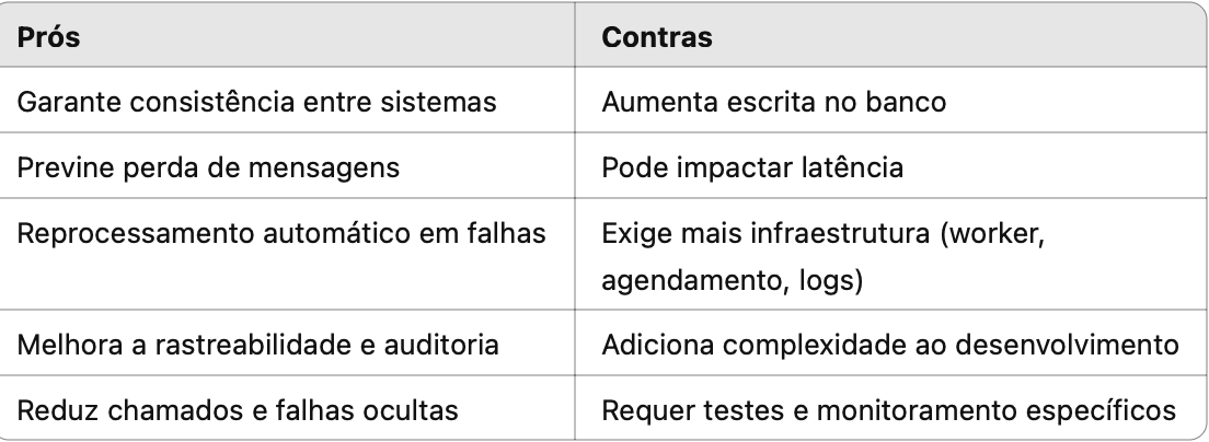 Vamos lá: o Outbox Pattern não é gratuito, nem em termos de recursos computacionais, nem em termos de complexidade. E, como toda escolha arquitetural séria, ele deve ser analisado com critério, à luz do seu contexto — técnico e de negócio.