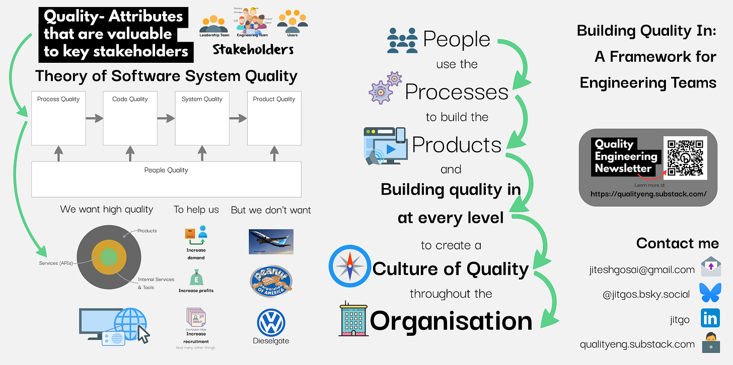 In this post, which shares the thinking behind my latest talk, Building Quality In - A Framework for Engineering Teams, I explore that question. Using findings from Google’s recent research into how engineers define and perceive quality, I outline a practical framework to help teams embed and sustain it. The aim is to help you shift from reacting to failures to actively shaping quality through the way you work, by building quality in your products, processes and people.