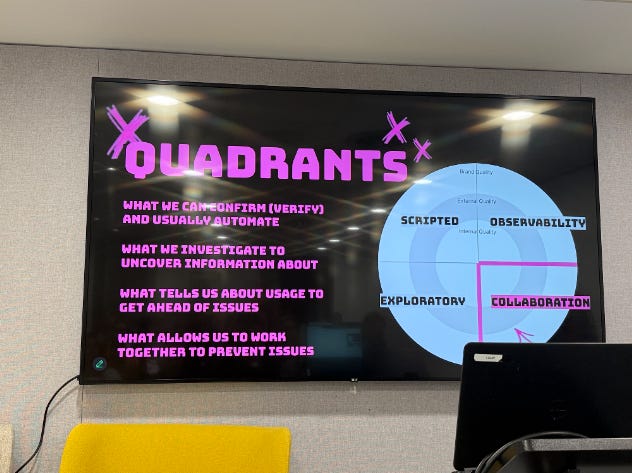 Callum Akehurst-Ryan introduced the Quality Radar. A lightweight visual to map what kinds of testing (and by extension, feedback) you’re doing across your system.