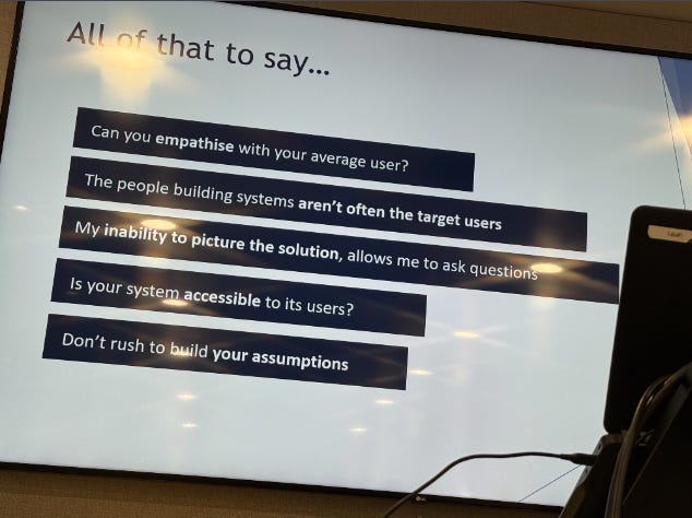With AI becoming more integrated in systems, this becomes even more important. Biases aren’t just bugs, they’re baked into data, processes, and the choices we make without thinking. Emily made a strong case for sharpening the skill of assumption-hunting, and I left wondering: could AI tools help us find assumptions as well as we find failures?