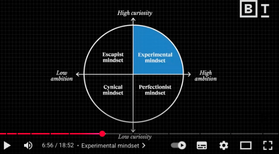 She also introduces a 2×2 matrix on curiosity and ambition. The goal is to operate in the quadrant of high curiosity and high ambition. What she calls the experimental mindset. That’s where progress and learning happen.